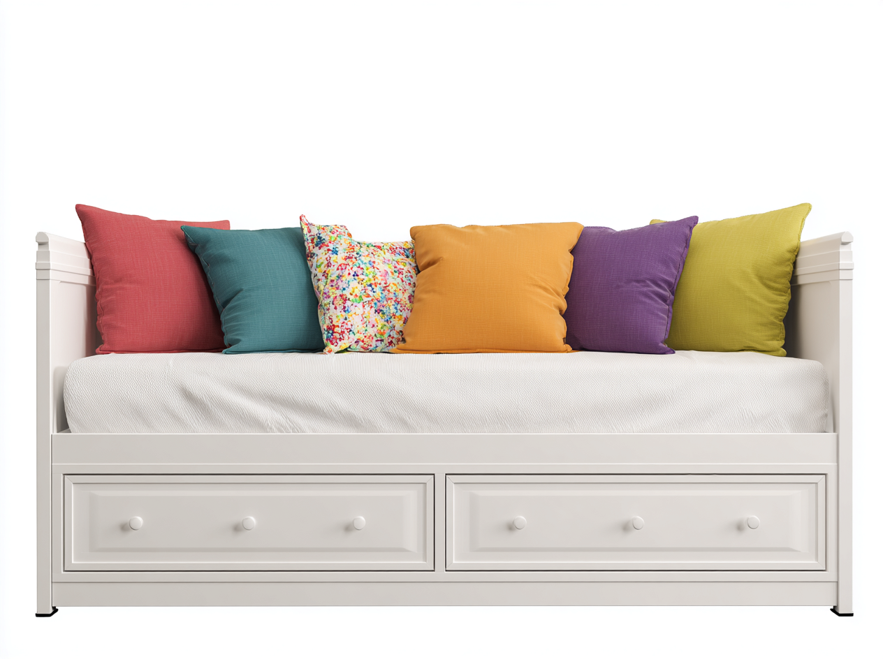 Das Schlafsofa besteht aus einer stabilen Holzkonstruktion in weißer Ausführung. Die sorgfältige Verarbeitung gewährleistet eine zuverlässige Stabilität im täglichen Gebrauch. Die glatten Oberflächen sind pflegeleicht und tragen zu einer langlebigen Nutzung bei.